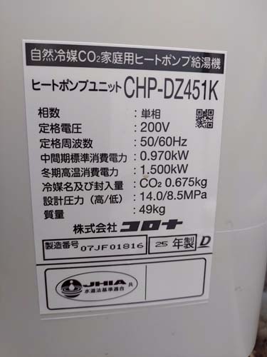 新宮市緑ヶ丘 コロナ自然冷媒CO2家庭用ヒートポンプ給湯機 ヒートポンプユニットCHP-DZ451K エコキュート交換工事|和歌山エコキュート取り付け工事センター
