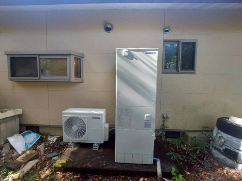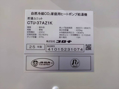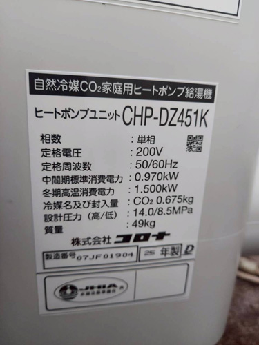 有田市箕島 コロナ自然冷媒CO2家庭用ヒートポンプ給湯機ヒートポンプユニットCHP-DZ451K、貯湯ユニットCTU-37AZ1K エコキュート交換工事